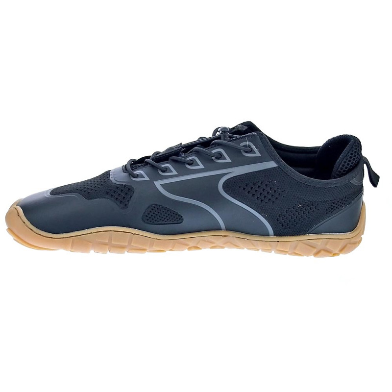 Estas zapatillas bajas veganas en textil transpirable, en negro te ofrecen estilo y comodidad. El sistema de cierre con cordón elástico permite un ajuste rápido y cómodo. Su diseño incorpora tejido de malla combinado con refuerzos laterales que aportan sujeción sin restar ligereza. La amplia puntera sigue externamente la silueta natural de los dedos, y la suela de goma complemente plana (zero drop), incorpora un patrón de relieve que mejora la tracción y se adapta a los movimientos del pie.